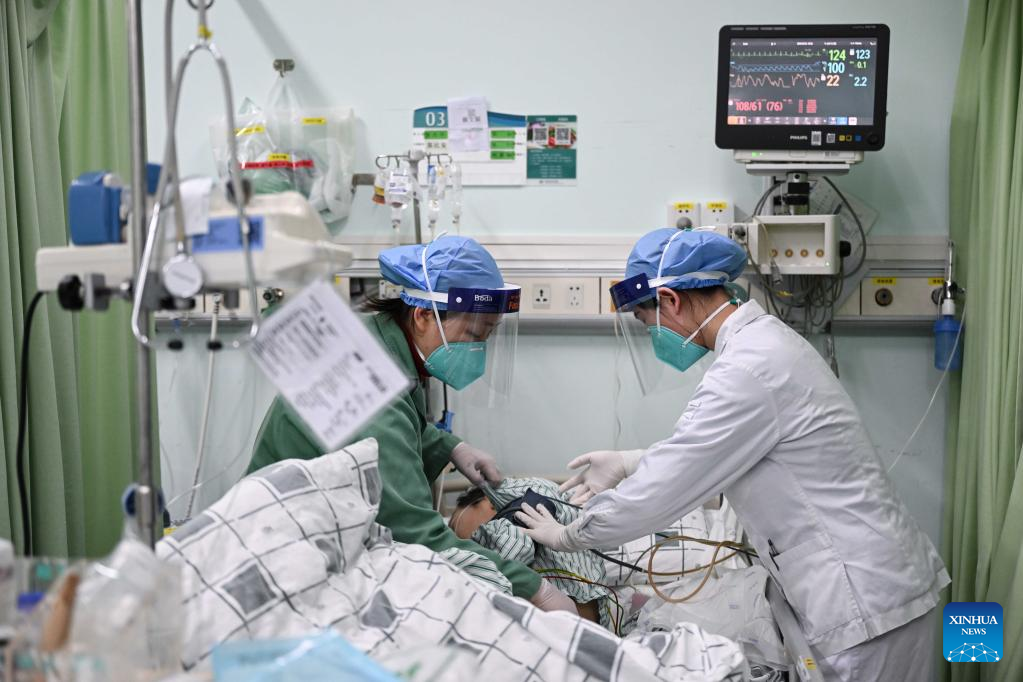 Medical staff check the condition of a patient at the intensive care unit of Guangdong Provincial Hospital of Chinese Medicine in Guangzhou, south China's Guangdong Province, Jan. 21, 2023. Medical staff stick to their posts during the Spring Festival holiday. (Xinhua/Deng Hua)