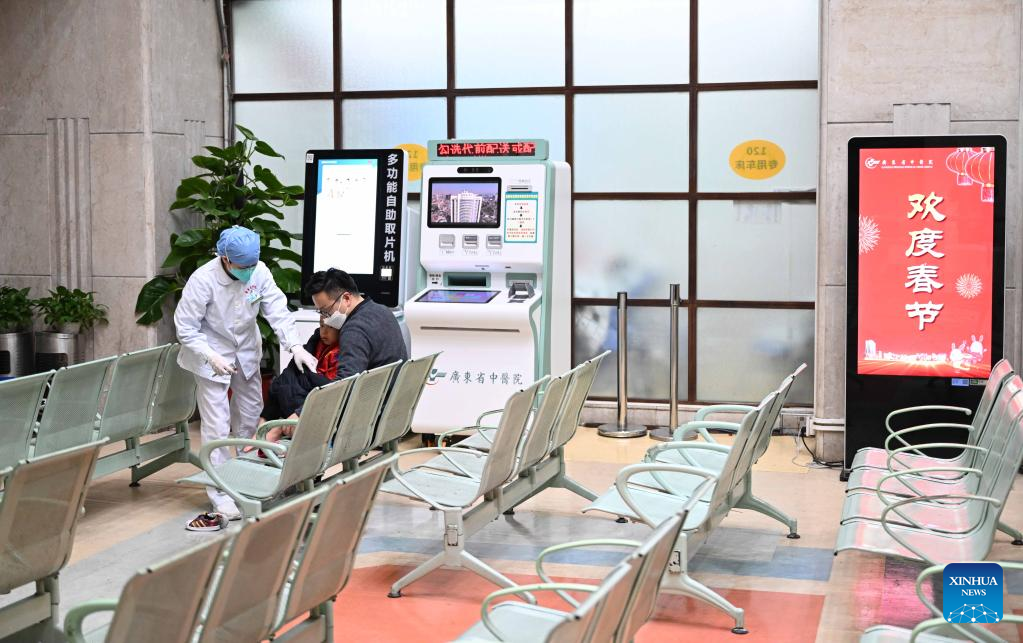 A medical worker checks the body temperature of a patient at the emergency department of Guangdong Provincial Hospital of Chinese Medicine in Guangzhou, south China's Guangdong Province, Jan. 21, 2023. Medical staff stick to their posts during the Spring Festival holiday. (Xinhua/Deng Hua)