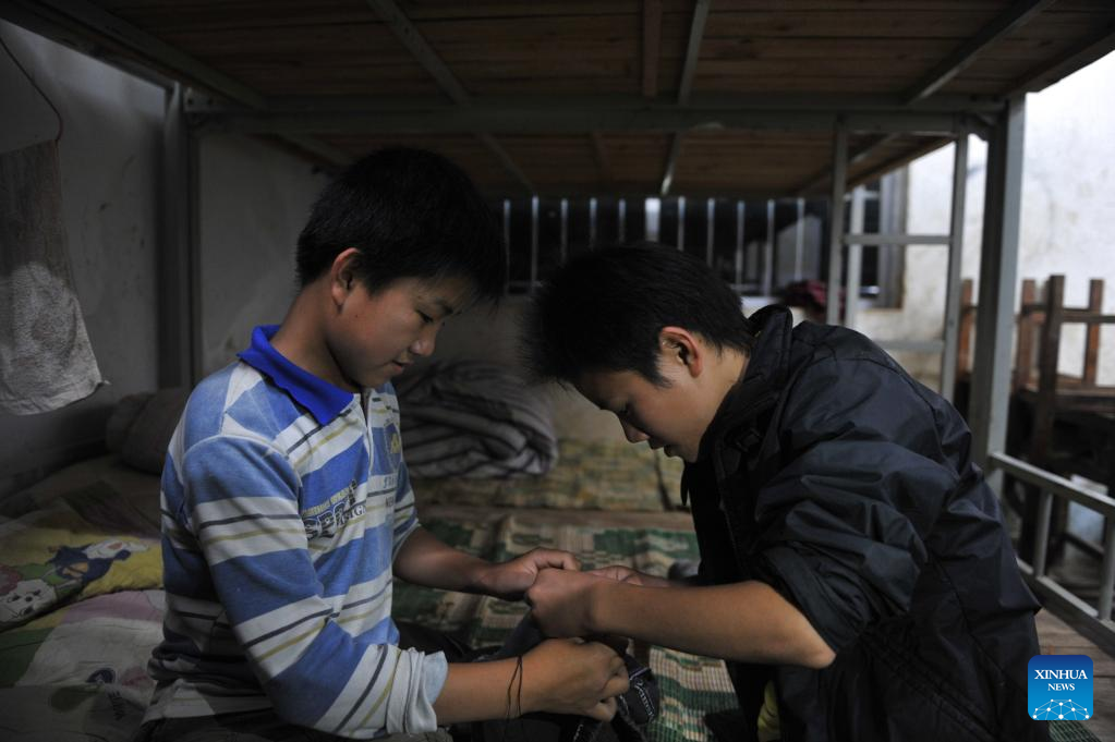 Meng Xuanren (L) sews clothes at his dormitory in Nongyong primary school in Bansheng Town of Dahua Yao Autonomous County, south China's Guangxi Zhuang Autonomous Region, May 3, 2014.