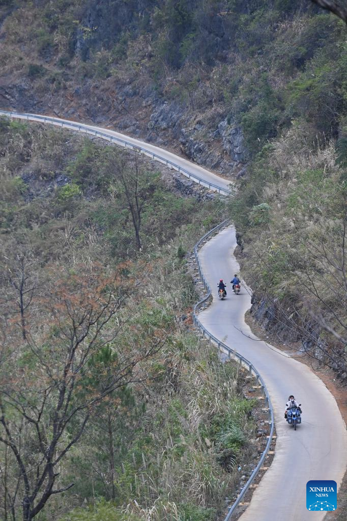 Meng Xuantai (upper R) and his friend are on their way home in Nongding Village of Bansheng Town, Dahua Yao Autonomous County, south China's Guangxi Zhuang Autonomous Region, Jan. 20, 2023. A cement road was built in Nongding Village in 2016.