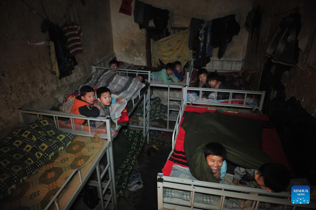 Meng Xuantai (1st L) and Meng Xuanren (2nd L) are seen at their dormitory at Nongyong primary school in Bansheng Town of Dahua Yao Autonomous County, south China's Guangxi Zhuang Autonomous Region, Dec. 26, 2012.
