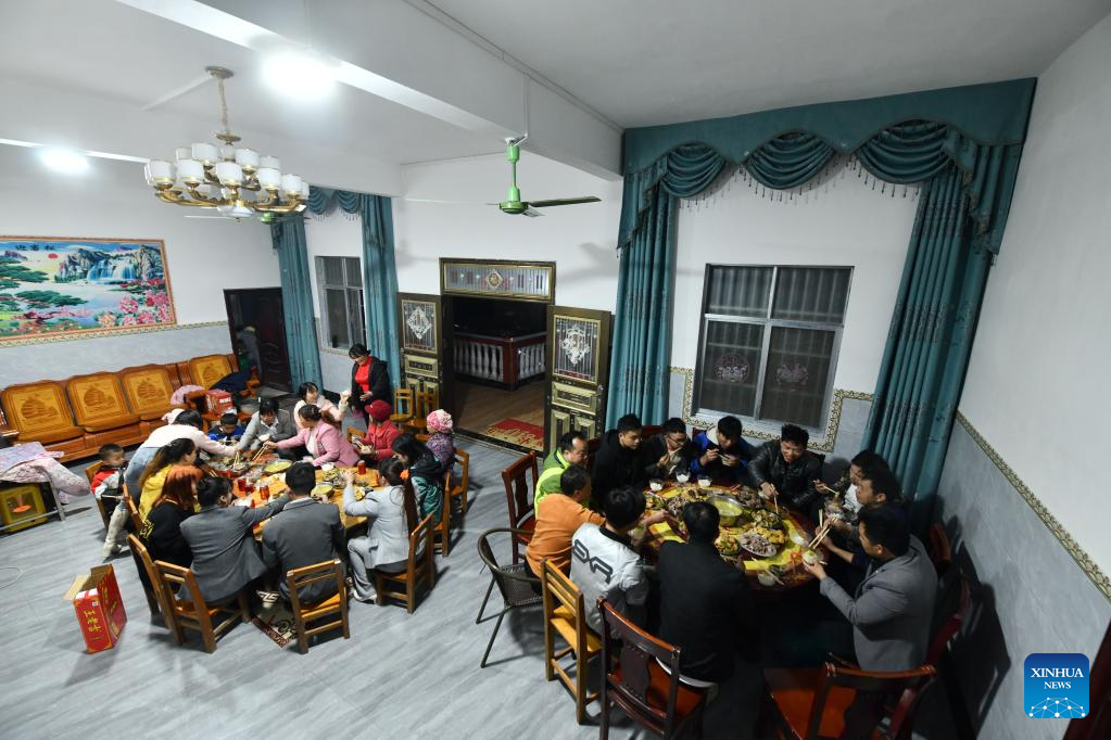 Meng Xuanren, Meng Xuantai and their relatives enjoy a feast in Nongding Village of Bansheng Town, Dahua Yao Autonomous County, south China's Guangxi Zhuang Autonomous Region, Jan. 20, 2023.
