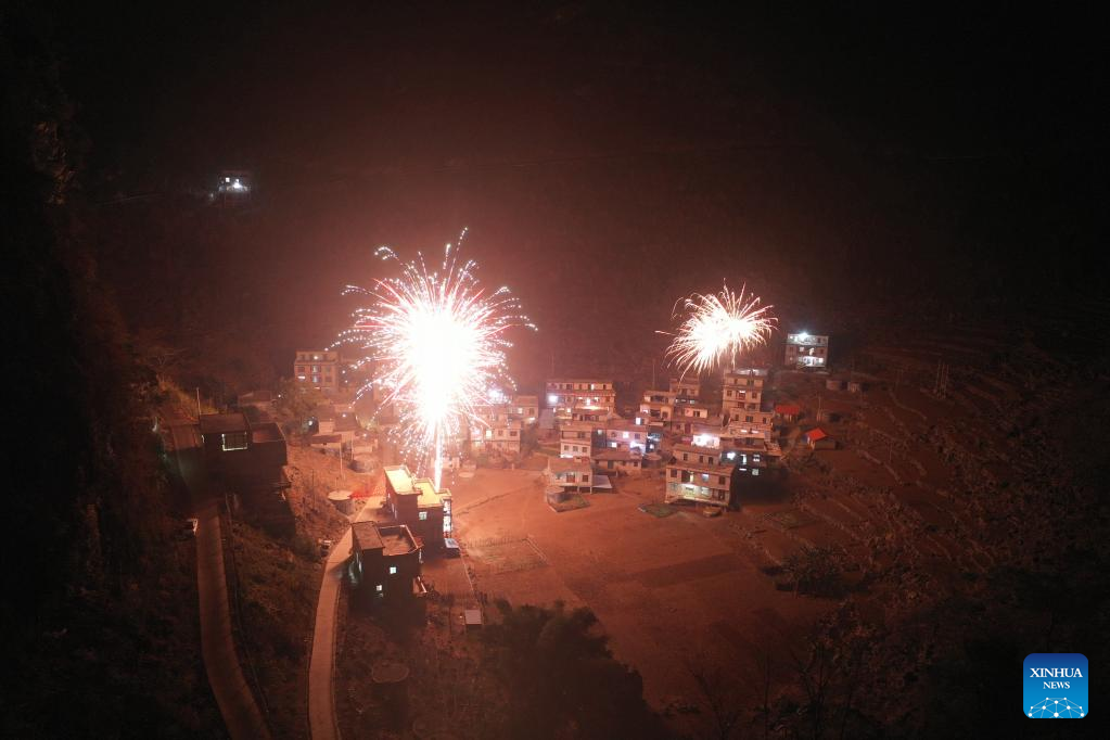 This aerial photo shows a night view of Nongding Village of Bansheng Town, Dahua Yao Autonomous County, south China's Guangxi Zhuang Autonomous Region, Jan. 21, 2023.