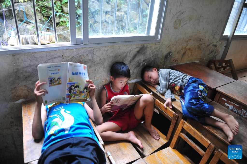 Meng Xuantai (C) reads a book before noon break at Nongyong primary school in Bansheng Town of Dahua Yao Autonomous County, south China's Guangxi Zhuang Autonomous Region, July 2, 2014.