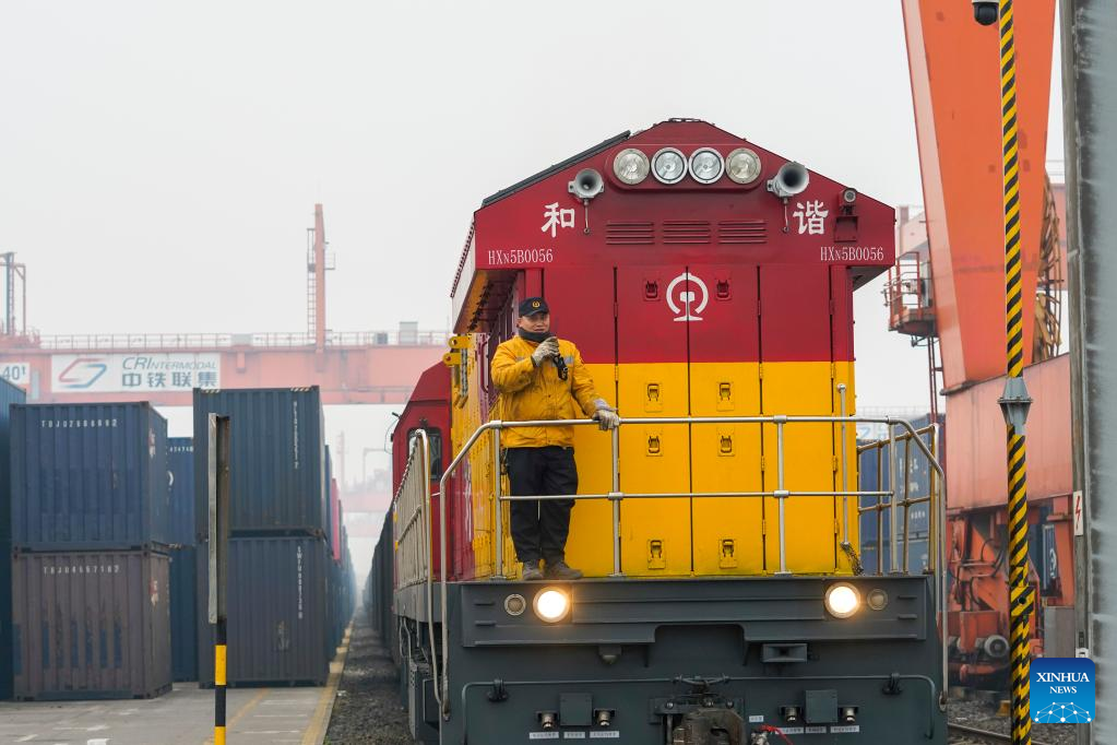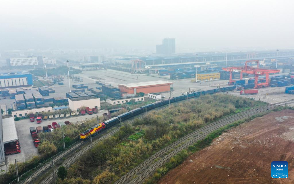 This aerial photo shows a rail-sea intermodal freight train carrying containers of goods, including cars, motorcycles, engines, and sodium carbonate, at Tuanjie Village Central Station in southwest China's Chongqing, Jan. 22, 2023. It was the city's first outbound cargo train of the New International Land-Sea Trade Corridor in the Year of the Rabbit. Goods on the train will be transported to Qinzhou port on the country's southern coast, from where they will be shipped to Indonesia, the Philippines, Australia, and some other countries and regions. (Xinhua/Liu Chan)