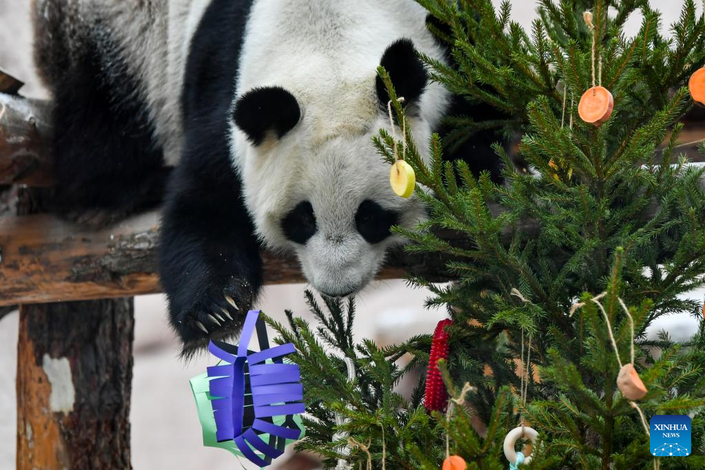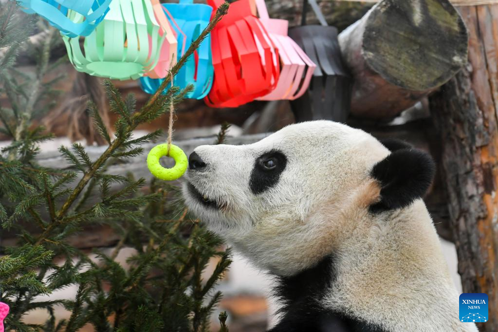 Giant panda Dingding plays with festive decorations at the Moscow Zoo in Moscow, capital of Russia, Jan. 23, 2023. The Moscow Zoo prepared food and festive decorations for giant pandas to celebrate the Chinese Lunar New Year. (Xinhua/Cao Yang)