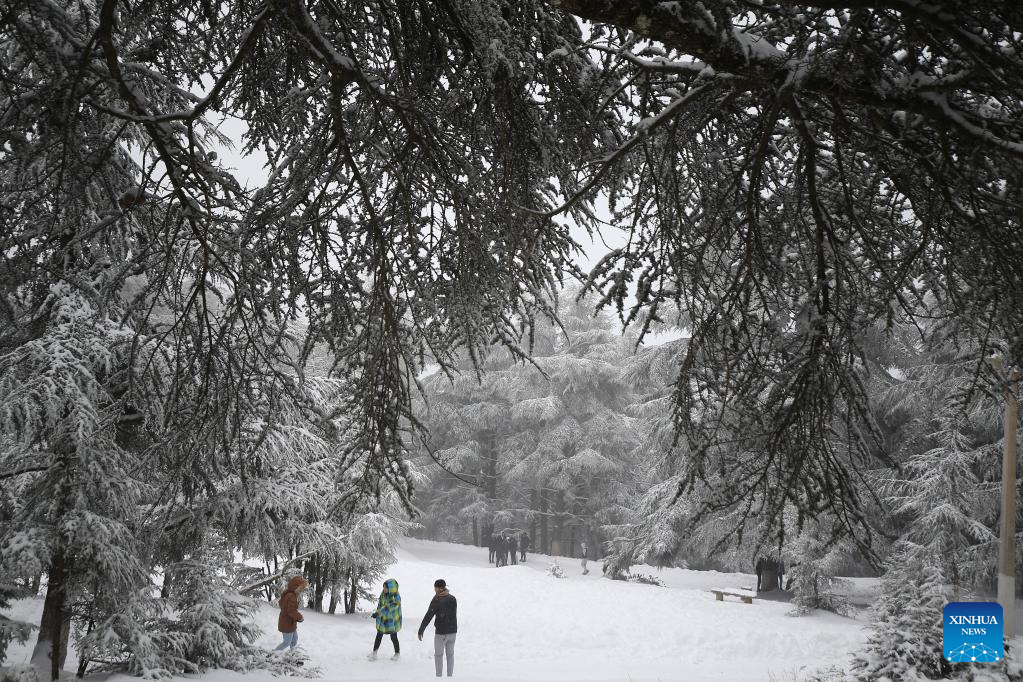 People enjoy the snow at Chrea National Park in Blida province, Algeria, Jan. 23, 2023. (Xinhua)