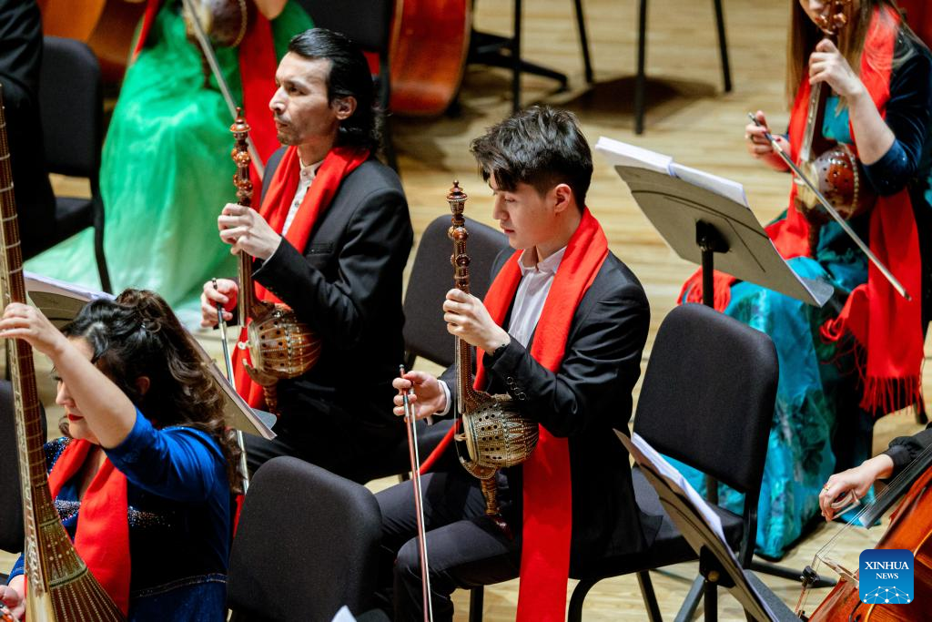 The orchestra is mainly composed of musical instruments played by Xinjiang's ethnic minorities, said Xu Zhijun, conductor of the concert. He added that its music embodies the flamboyant musical style along the Silk Road, thus possessing great potential for going global.