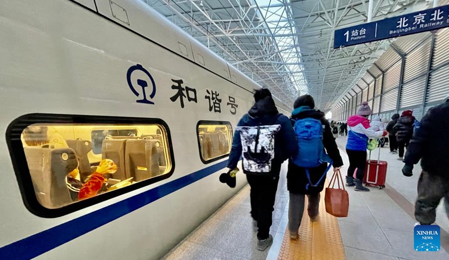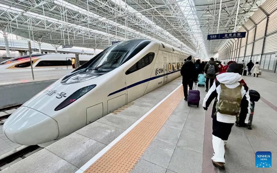 Passengers take a train at Beijing North Railway Station in Beijing, capital of China, Jan. 24, 2023. The Beijing-Zhangjiakou high-speed railway line brings great convenience to people's skiing trip to Chongli district of Zhangjiakou City in north China's Hebei province. (Xinhua/Li Xin)