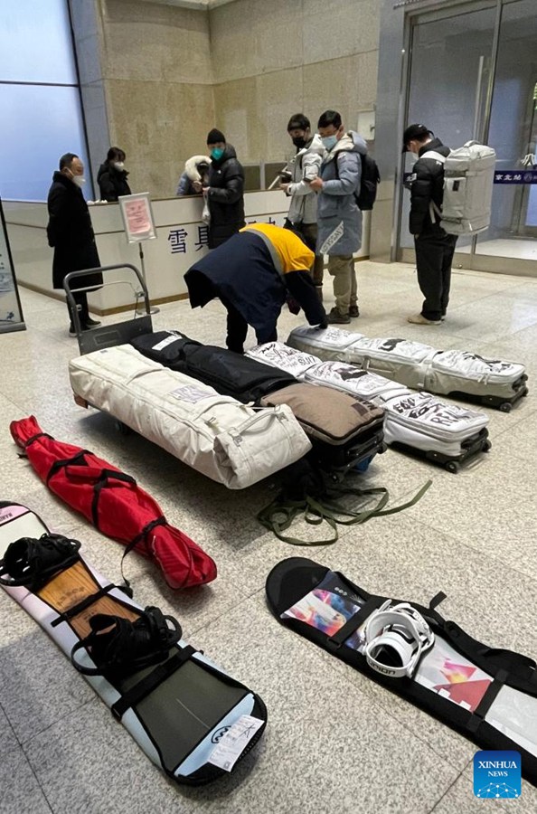 Skiers check in skiing equipment at Beijing North Railway Station in Beijing, capital of China, Jan. 24, 2023. The Beijing-Zhangjiakou high-speed railway line brings great convenience to people's skiing trip to Chongli district of Zhangjiakou City in north China's Hebei province. (Xinhua/Li Xin)