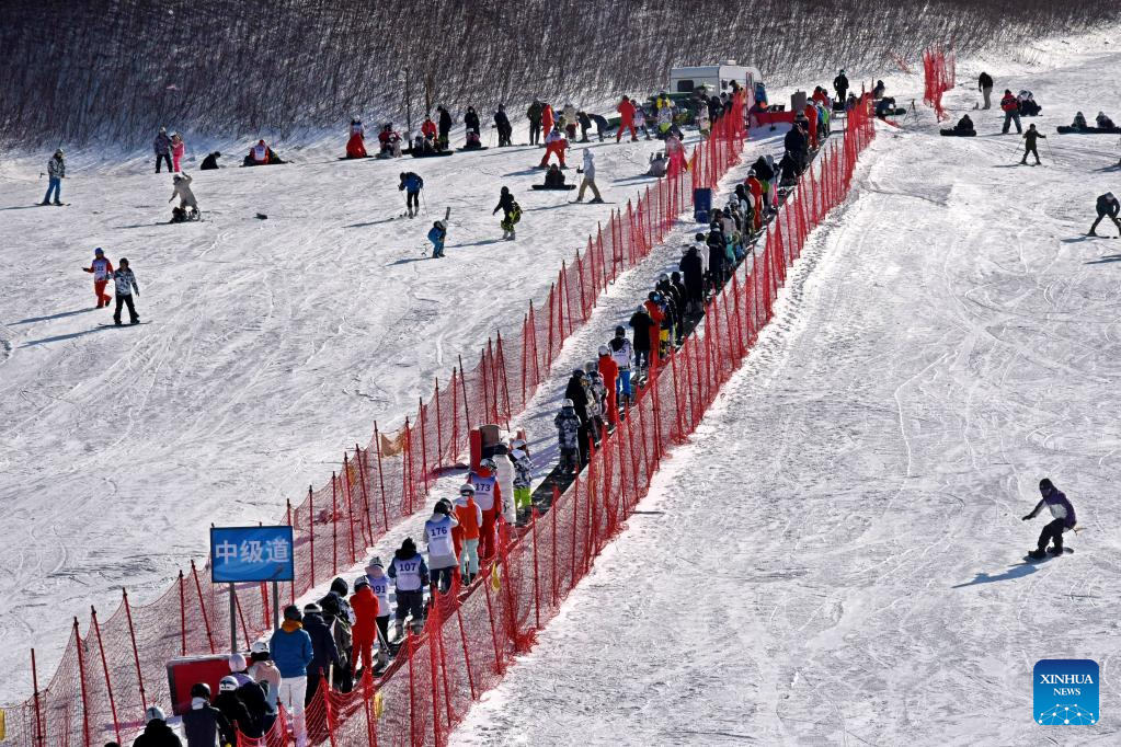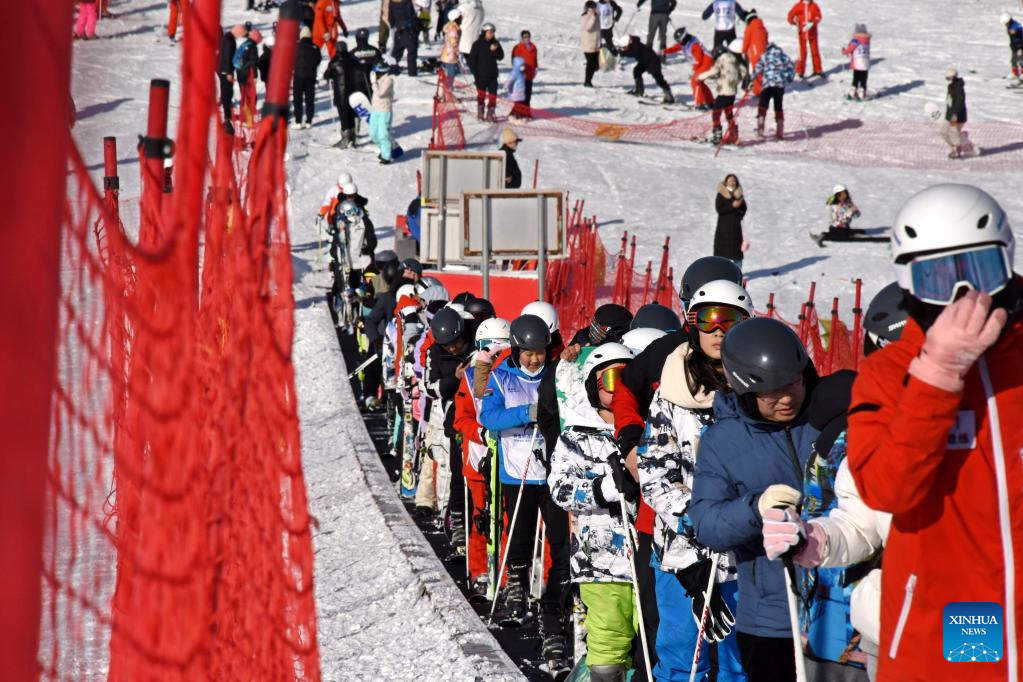 People have fun at a ski resort in Qingdao, east China's Shandong Province, Jan. 25, 2023. During the Spring Festival holiday, ski resorts in Qingdao have made full preparations to improve consumption experience and meet the demand of an increasing number of tourists. (Xinhua/Li Ziheng)