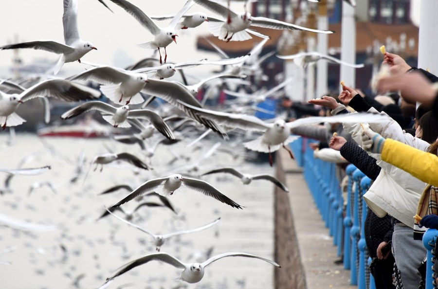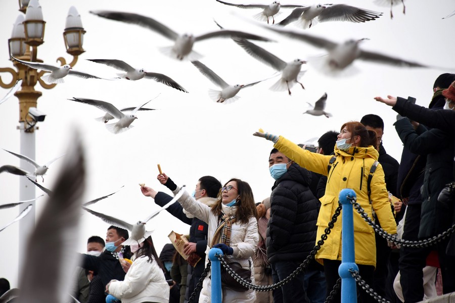 Visitors watch seagulls in Qingdao, east China's Shandong Province, Jan. 26, 2023. (Xinhua/Li Ziheng)