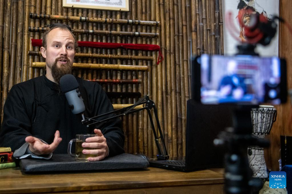 Jake Lee Pinnick records a course at his home in Danjiangkou, central China's Hubei Province, Jan. 12, 2023. (Xinhua/Wu Zhizun)