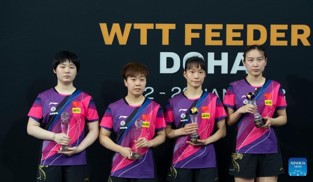 Gold medalists Qian Tianyi(1st R)/Shi Xunyao(2nd R) of China and silver medalists Zhang Rui(2nd L)/Kuai Man of China pose on the podium during the awarding ceremony of the women's doubles final match between Qian Tianyi/Shi Xunyao and Zhang Rui/Kuai Man of China at WTT Feeder Doha 2023 in Doha, Qatar, Jan. 26, 2023. (Photo by Nikku/Xinhua)