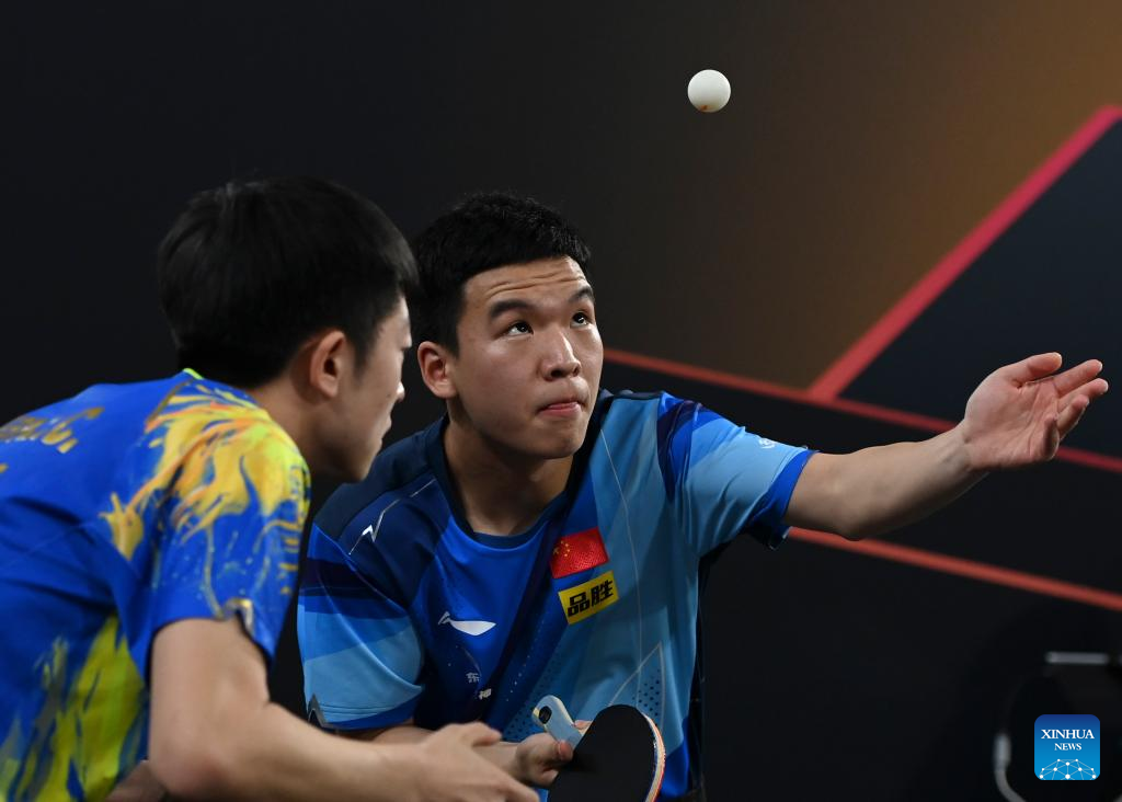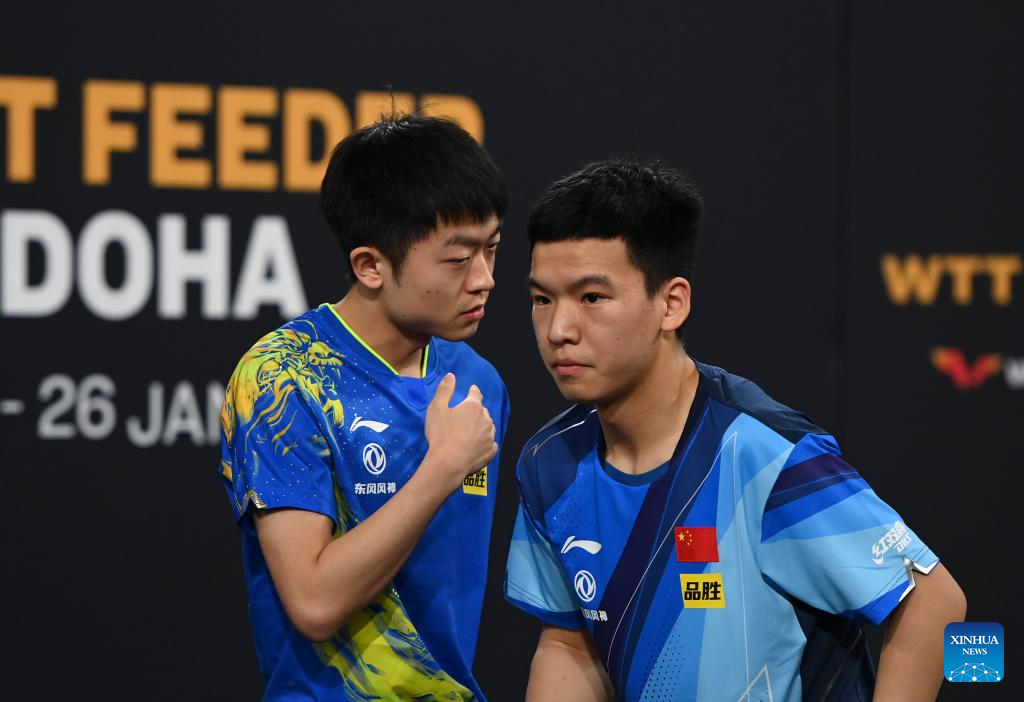Xu Yingbin of China hits a return during the men's singles final match against his compatriot Zhou Kai at WTT Feeder Doha 2023 in Doha, Qatar, Jan. 26, 2023. (Photo by Nikku/Xinhua)