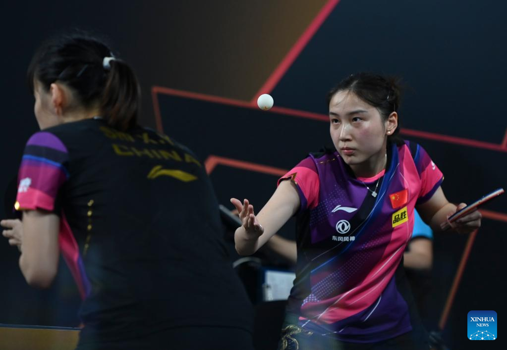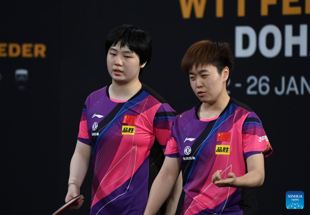Qian Tianyi(L)/Shi Xunyao of China communicate during the women's doubles final match between Qian Tianyi/Shi Xunyao and Zhang Rui/Kuai Man of China at WTT Feeder Doha 2023 in Doha, Qatar, Jan. 26, 2023. (Photo by Nikku/Xinhua)