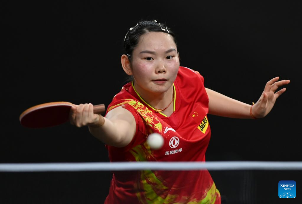 He Zhuojia of China hits a return during the women's singles final match against her compatriot Kuai Man at WTT Feeder Doha 2023 in Doha, Qatar, Jan. 26, 2023. (Photo by Nikku/Xinhua)