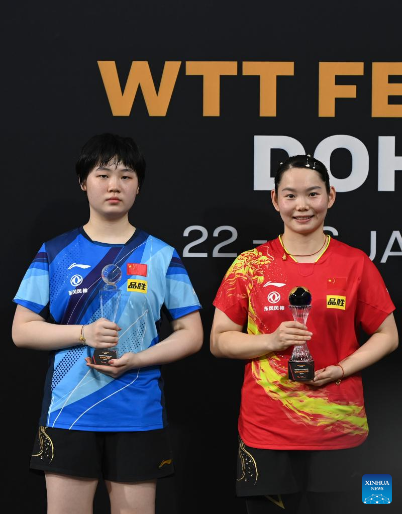 He Zhuojia (R) and Kuai Man of China pose with the trophies during the awarding ceremony after their women's singles final match at WTT Feeder Doha 2023 in Doha, Qatar, Jan. 26, 2023. (Photo by Nikku/Xinhua)