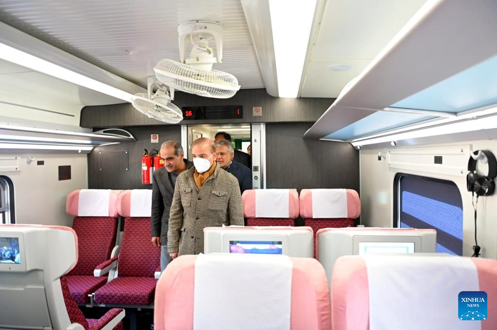 Pakistani Prime Minister Shahbaz Sharif (Front) visits an imported train coach from China at a railway station in Islamabad, Pakistan, on Jan. 27, 2023. Sharif said on Friday that the newly imported train coaches from China will help Pakistan Railways to attract passengers and increase revenue. (PID/Handout via Xinhua)