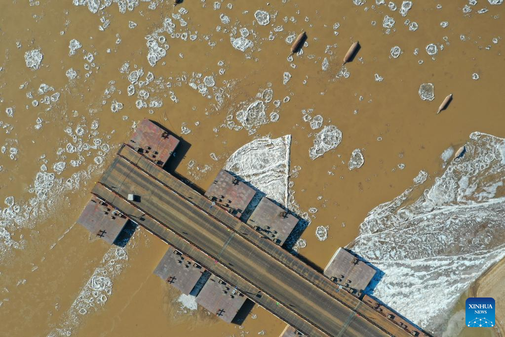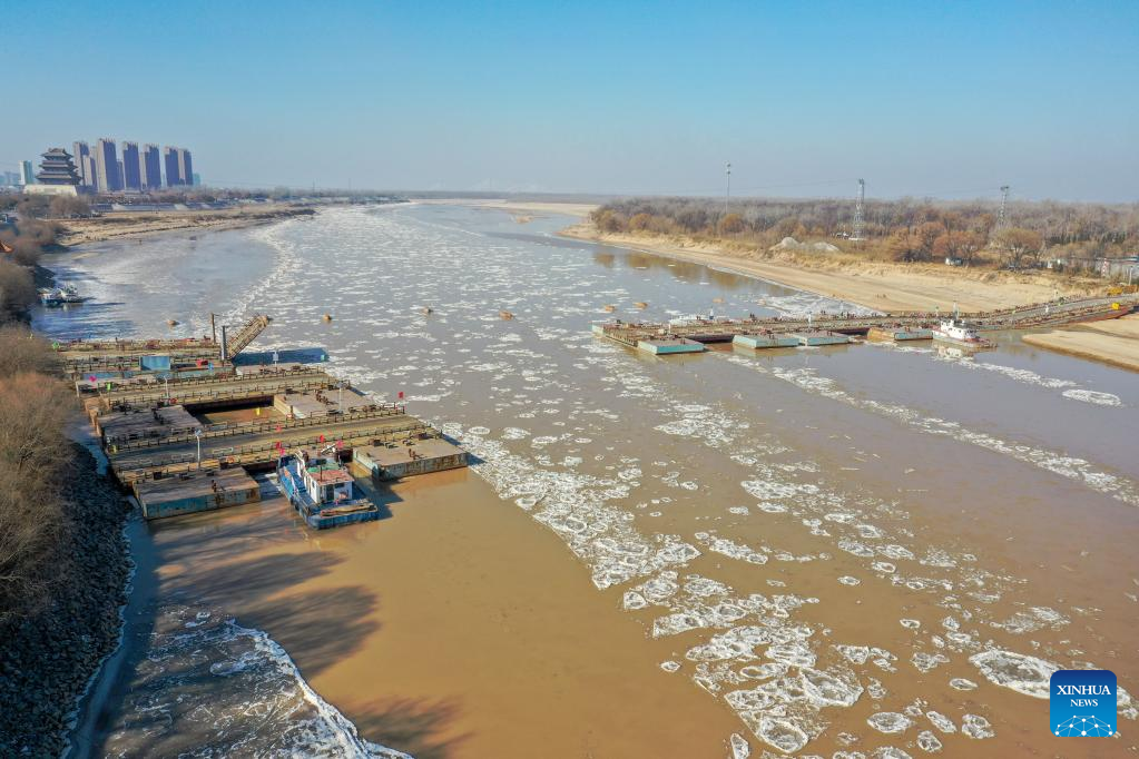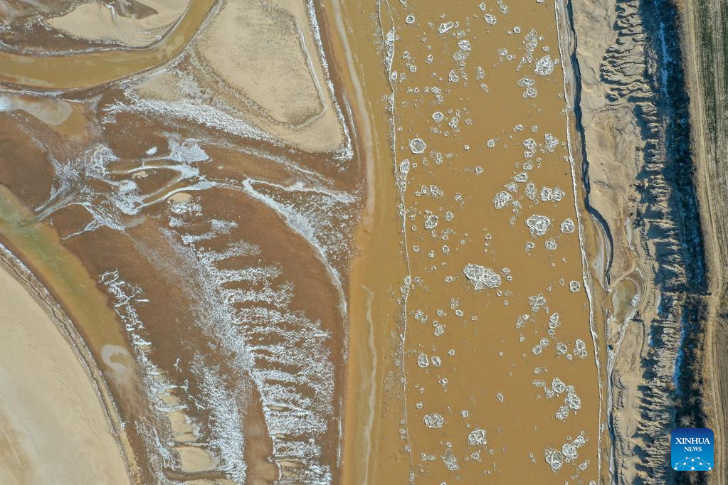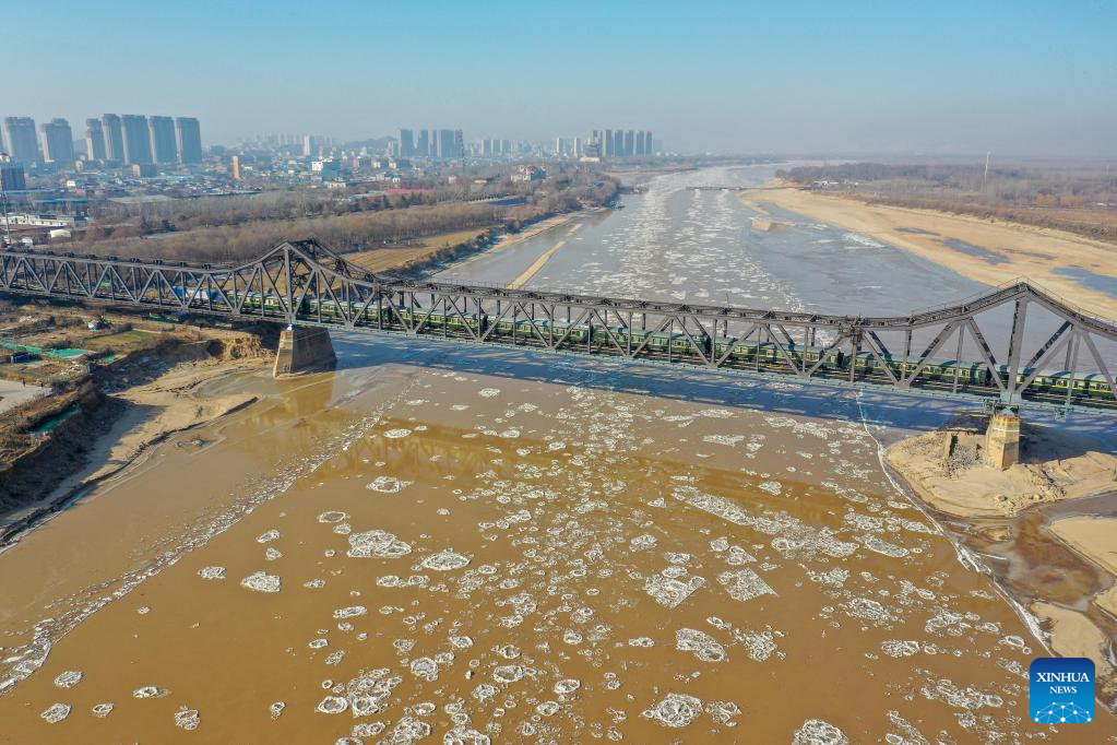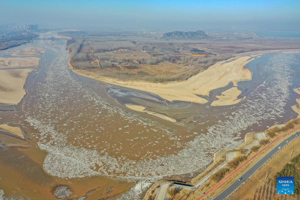 This aerial photo taken on Jan. 27, 2023 shows ice jam on the Yellow River in Jinan, east China's Shandong Province. The segment of the Yellow River in Jinan City witnessed ice jam scenes due to a strong cold wave recently. (Xinhua/Zhu Zheng)