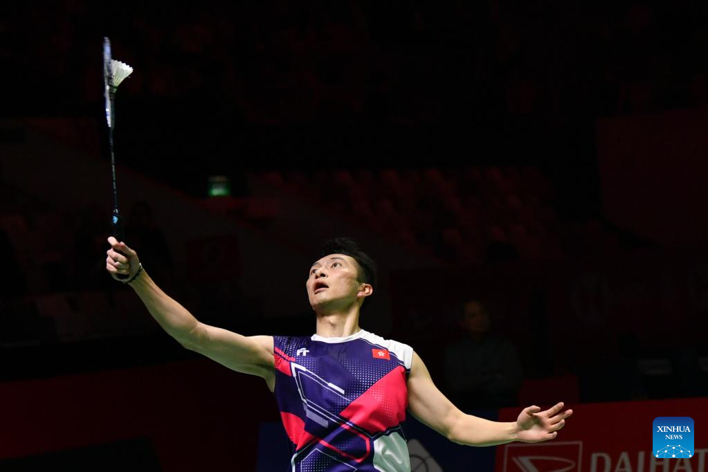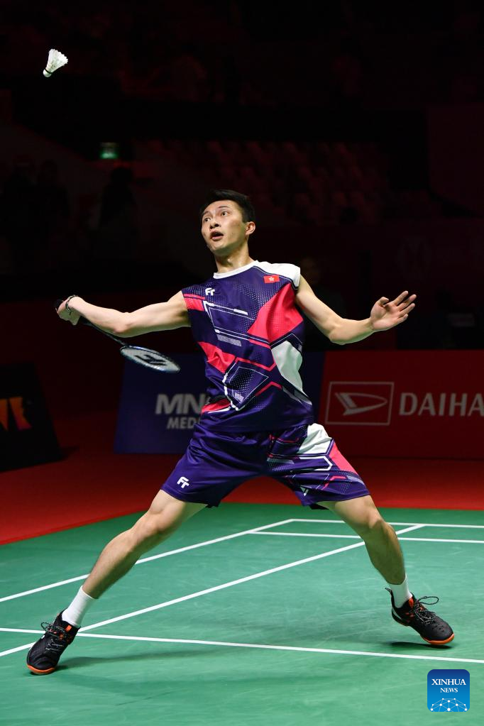 Ng Ka Long Angus of Hong Kong, China hits a return during the men's singles quarterfinal match between Kanta Tsuneyama of Japan and Ng Ka Long Angus of Hong Kong, China at Indonesia Masters 2023 badminton tournament in Jakarta, Indonesia, Jan. 27, 2023. (Xinhua/Xu Qin)