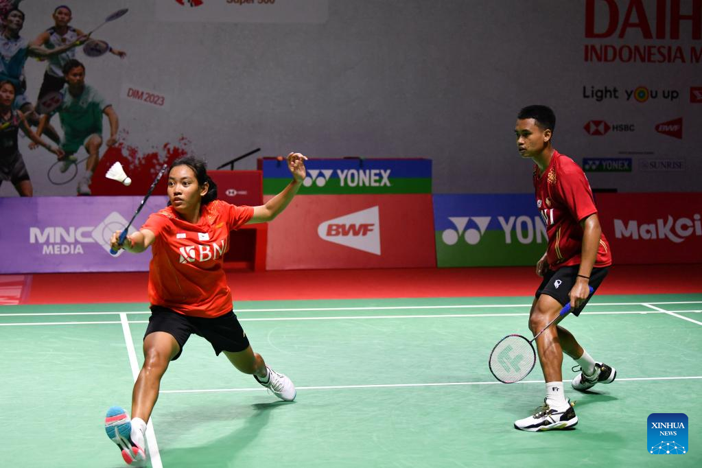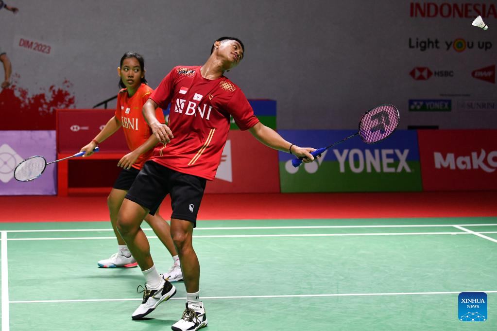 Jafar Hidayatullah(R)/Aisyah Salsabila Putri Pranata of Indonesia compete during the mixed doubles quarterfinal match between Jafar Hidayatullah/Aisyah Salsabila Putri Pranata of Indonesia and Feng Yanzhe/Huang Dongping of China at Indonesia Masters 2023 badminton tournament in Jakarta, Indonesia, Jan. 27, 2023. (Xinhua/Xu Qin)