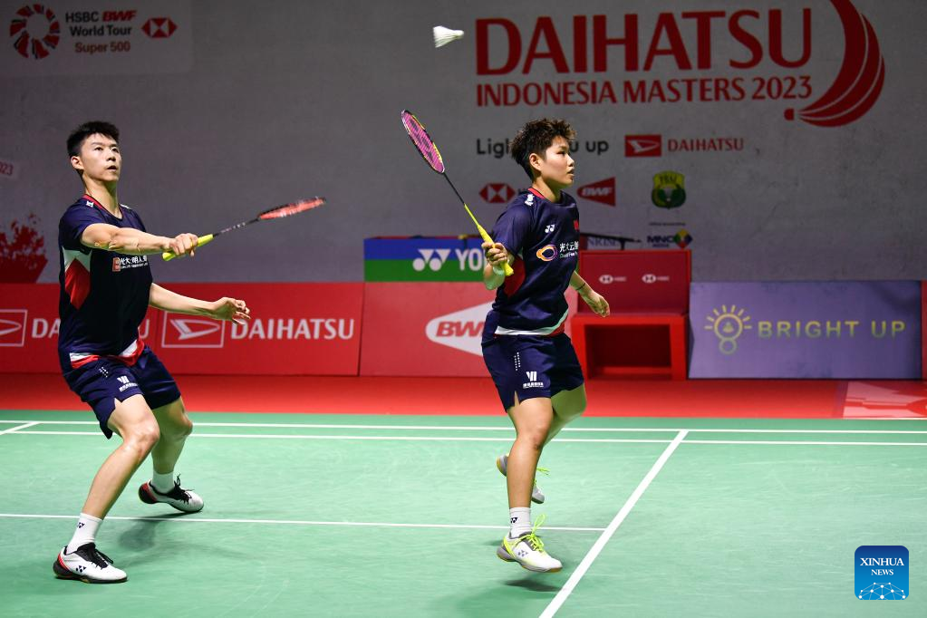 Feng Yanzhe/Huang Dongping (L) of China compete during the mixed doubles quarterfinal match between Jafar Hidayatullah/Aisyah Salsabila Putri Pranata of Indonesia and Feng Yanzhe/Huang Dongping of China at Indonesia Masters 2023 badminton tournament in Jakarta, Indonesia, Jan. 27, 2023. (Xinhua/Xu Qin)