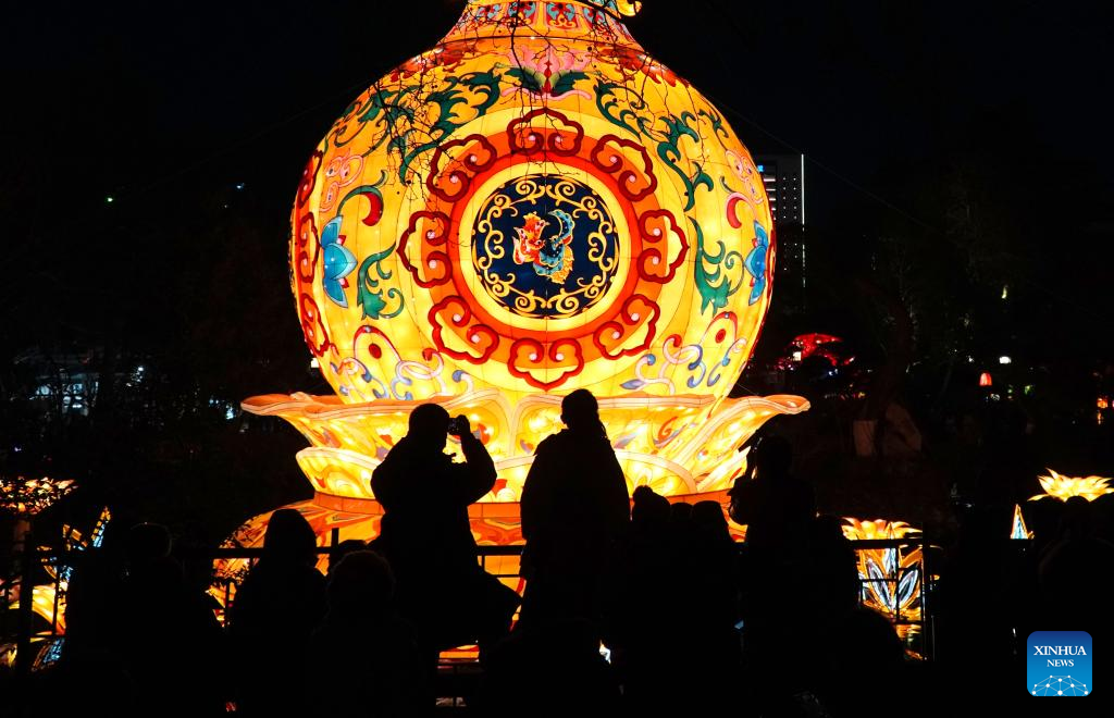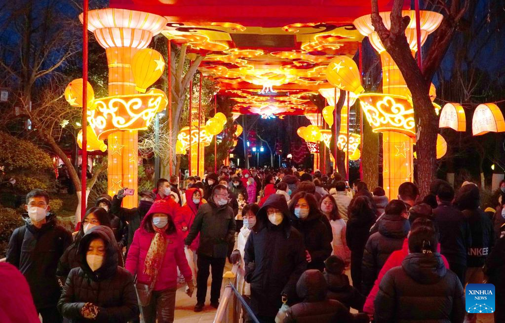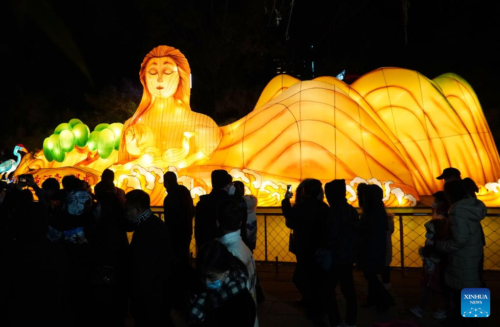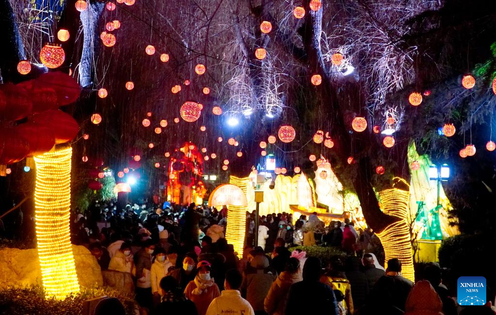 People enjoy the lantern show at the Baotu Spring Park in Jinan, capital city of east China's Shandong Province, Jan. 27, 2023. The lantern show held in Baotu Spring Park has attracted over 350,000 tourists during the Spring Festival holiday. (Xinhua/Xu Suhui)