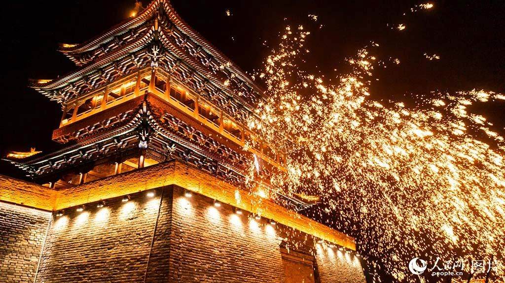 An ancient city in Xinzhou, north China’s Shanxi Province, is treated with a “datiehua” performance, or molten iron splashing, Jan. 24, 2023. (People’s Daily Online/Wang Fan)