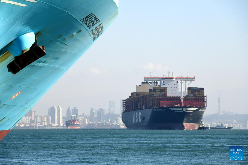 A container ship sails to Qianwan Container Terminal of Qingdao Port in east China's Shandong Province, Jan. 27, 2023. (Xinhua/Li Ziheng)
