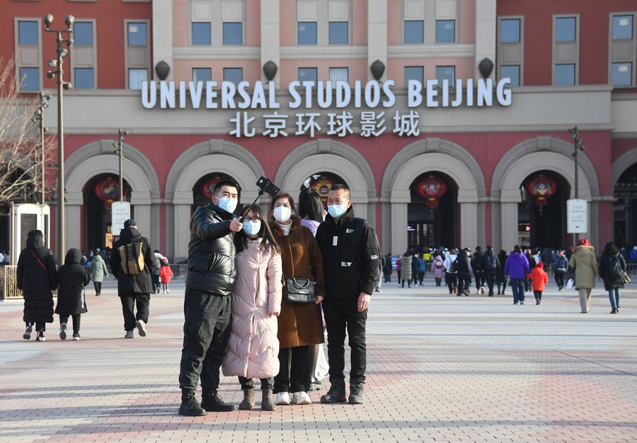Tourists pose for photos at the Universal Beijing Resort in Beijing, capital of China, Jan. 22, 2023.(Xinhua/Ren Chao)