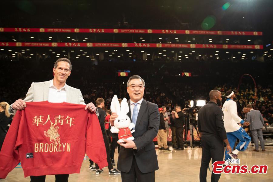 Chinese Consul General in New York Huang Ping (Front R) and BSE Global CEO Sam Zussman pose for a photo after presenting each other Chinese New Year gifts on Jan. 26, 2023. (Photo: China News Service/Liao Pan)