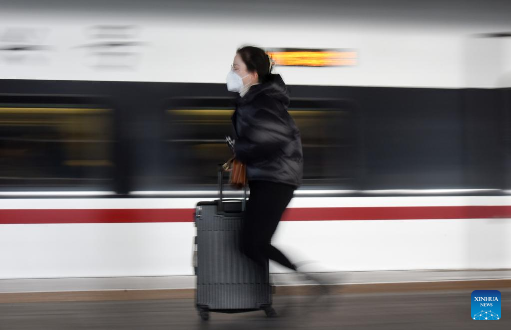 A passenger prepares to board a train at Fuyang West Railway Station in Fuyang City, east China's Anhui Province, Jan. 27, 2023. Fuyang West Railway Station was bustling with passengers on Friday, the last day of the Spring Festival holiday. As more railway stations have been put into use in the city, more people choose to travel by high-speed train to go to work or visit families. The city has seen a sharp increase in the number of railway passengers. (Xinhua/Guo Chen)