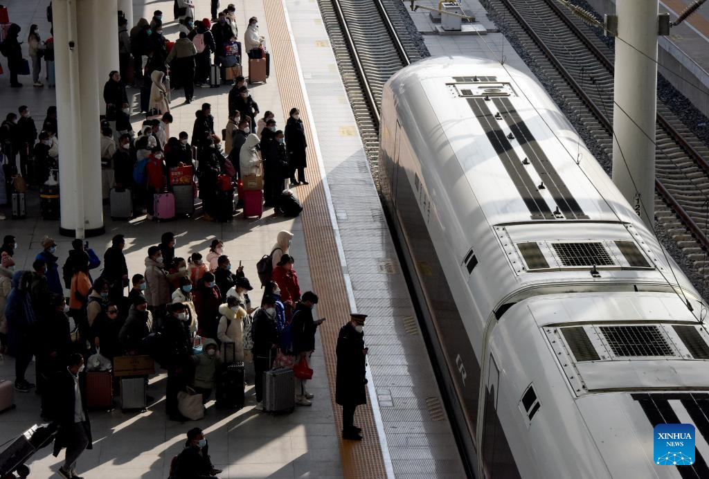 Passengers prepare to board a train at Fuyang West Railway Station in Fuyang City, east China's Anhui Province, Jan. 27, 2023. Fuyang West Railway Station was bustling with passengers on Friday, the last day of the Spring Festival holiday. As more railway stations have been put into use in the city, more people choose to travel by high-speed train to go to work or visit families. The city has seen a sharp increase in the number of railway passengers. (Xinhua/Guo Chen)