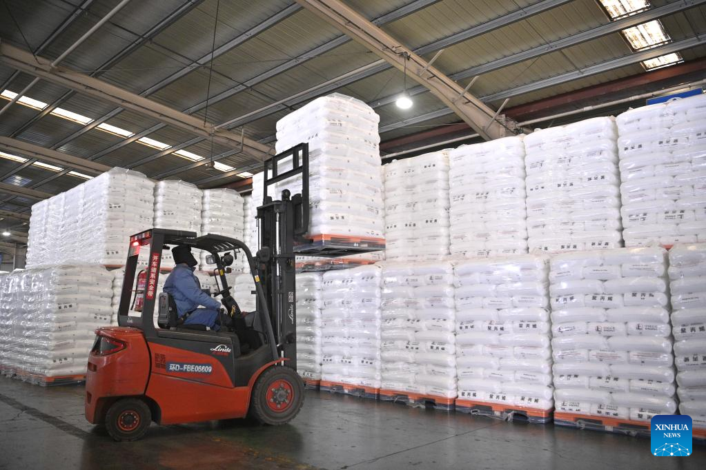 A staff member works at a warehouse in Qingdao, east China's Shandong Province, Jan. 28, 2023. Factories and companies across China resumed work after the Spring Festival holiday. (Photo by Liu Qiang/Xinhua)