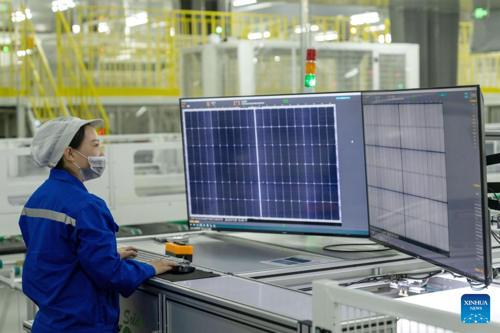 A staff member works at a solar photovoltaic module production company in Feidong County of Hefei, east China's Anhui Province, Jan. 28, 2023. Factories and companies across China resumed work after the Spring Festival holiday. (Photo by Ruan Xuefeng/Xinhua)