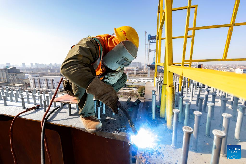 A worker works at a construction site of a highway section in Xiangyang, central China's Hubei Province, Jan. 28, 2023. Factories and companies across China resumed work after the Spring Festival holiday. (Photo by Jin Wei/Xinhua)