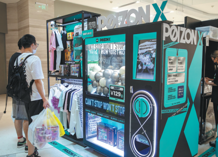 Customers experience a mystery box machine of online fashion firm POIZON in Shanghai on Aug 21. CHINA DAILY