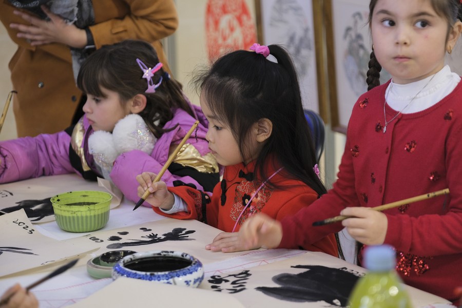 Children paint rabbits with Chinese brushes in Sliema, Malta, Jan. 28, 2023. (Photo by Jonathan Borg/Xinhua)