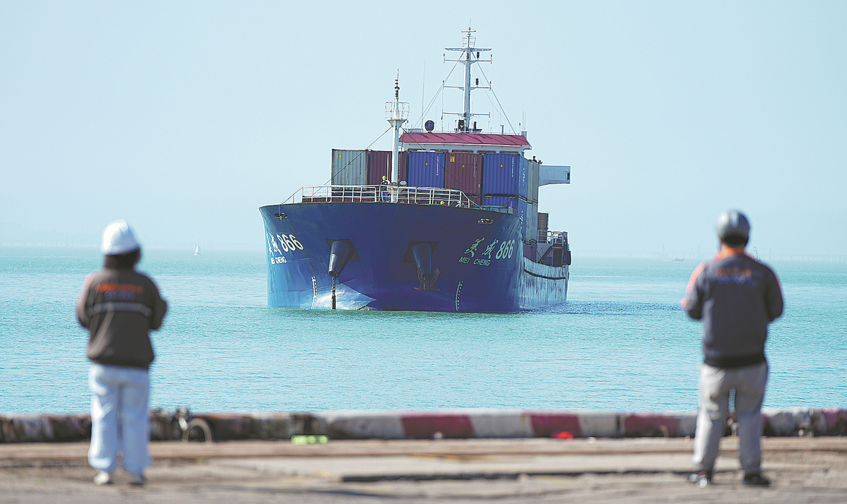 The ship carrying the duty-free goods enters the port, and is released after being inspected on Jan 13, 2023. ZHANG MAO/FOR CHINA DAILY