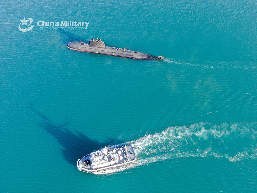 Two tugboats attached to a submarine flotilla with the navy under the PLA Northern Theater Command help a submarine to dock at a port during a combat exercise in January. (eng.chinamil.com.cn/Photo by Wu Haodong)