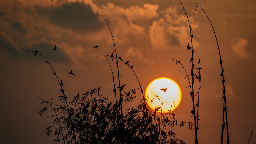 Photo shows blossom-headed parakeets against sunset in Ruili city, southwest China’s Yunnan Province. (Photo/Sun Dongjun)