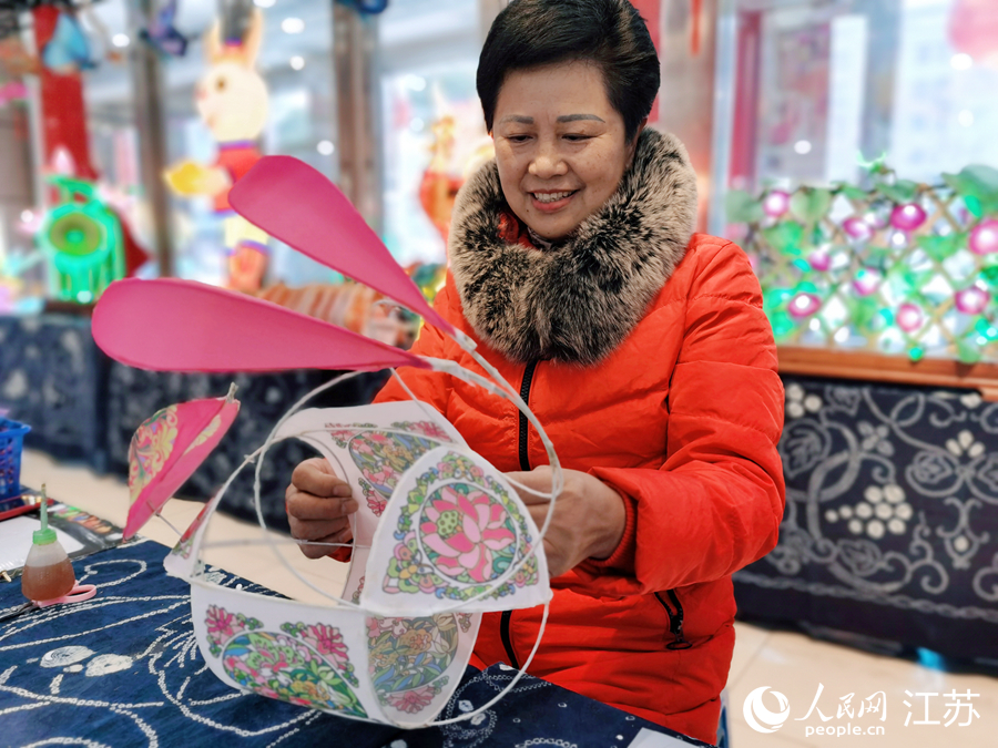 Shan Feng, an intangible cultural heritage inheritor, makes colorful lanterns at a lantern fair in Rugao, east China’s Jiangsu Province. (People’s Daily Online/Wang Jiliang)