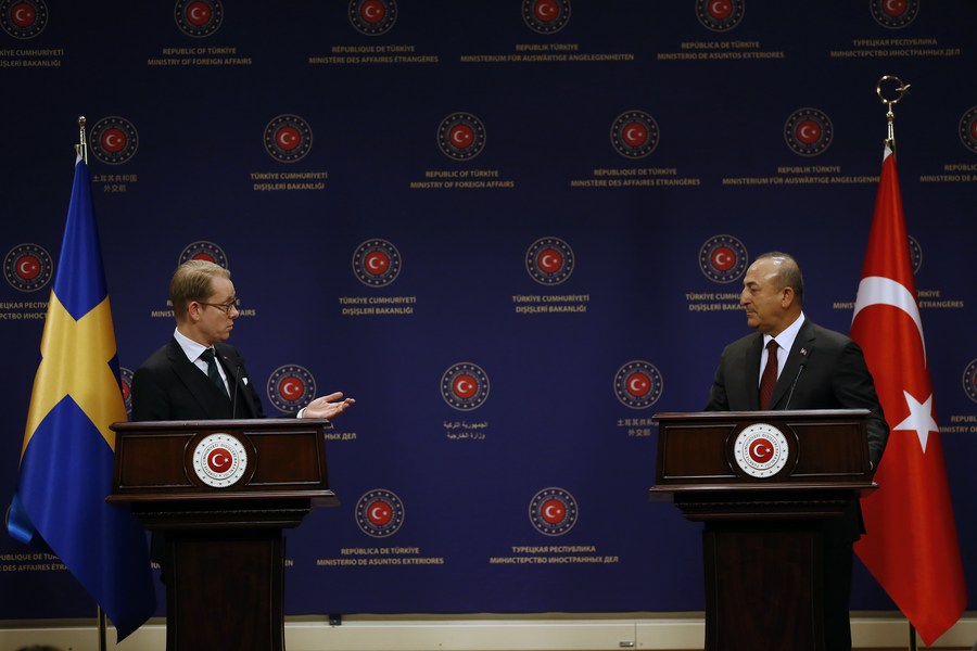 Turkish Foreign Minister Mevlut Cavusoglu (R) and Swedish Foreign Minister Tobias Billstrom hold a joint press conference in Ankara, Türkiye, on Dec. 22, 2022. (Photo by Mustafa Kaya/Xinhua)
