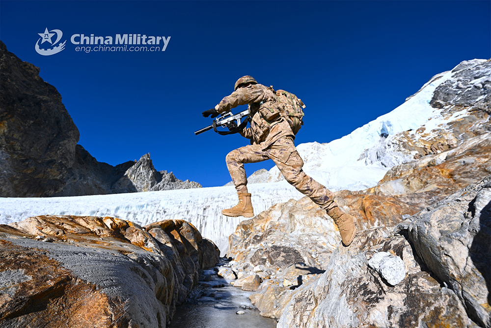 A soldier assigned to a PLA army brigade stationed in Xizang jumps over a frozen stream during a reconnaissance training exercise on plateau in late December of 2022. (eng.chinamil.com.cn/Photo by Yang Kai)