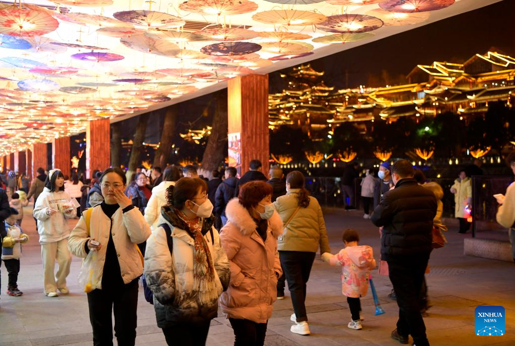 People enjoy lanterns at a scenic spot in Xuan'en County, central China's Hubei Province, Jan. 28, 2023. Xuan'en County has built footpaths, fountains and snack booths along the Gongshui River to boost nighttime economy. (Photo by Wang Jun/Xinhua)