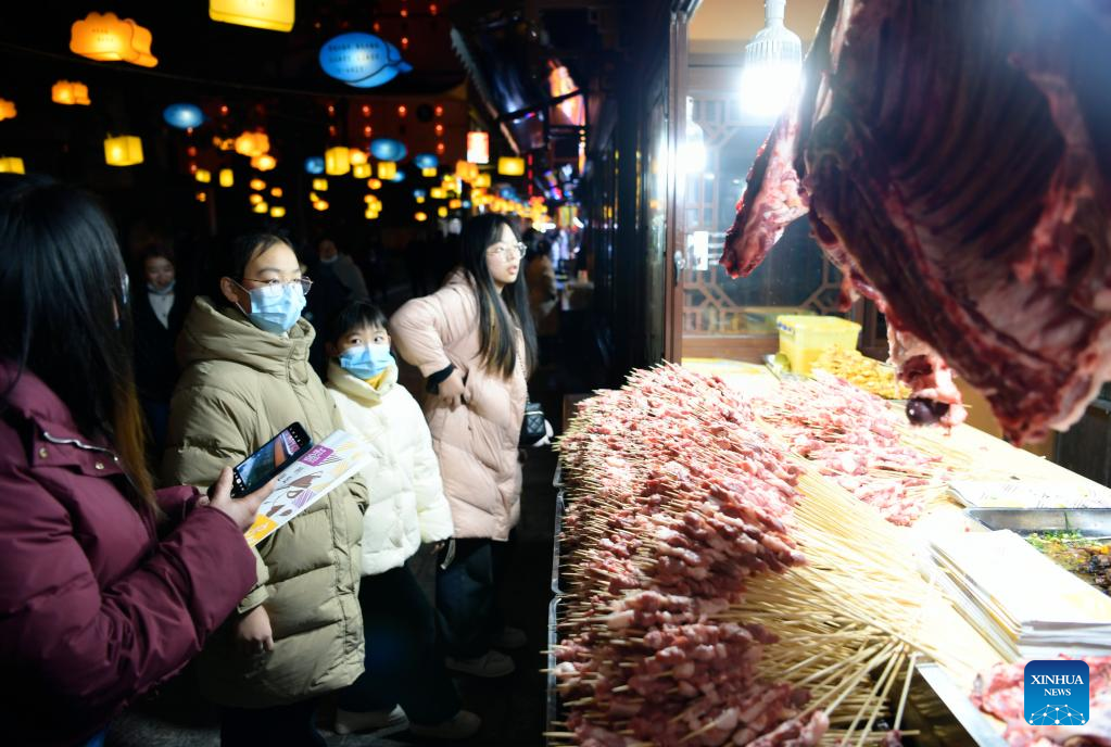 People buy kebabs at a scenic spot in Xuan'en County, central China's Hubei Province, Jan. 29, 2023. Xuan'en County has built footpaths, fountains and snack booths along the Gongshui River to boost nighttime economy. (Photo by Song Wen/Xinhua)