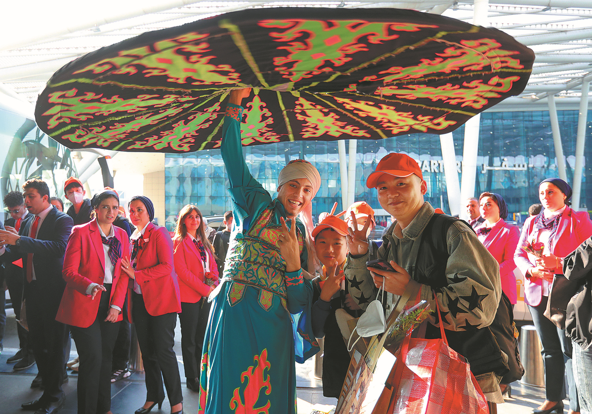 An Egyptian dancer takes photos with Chinese tourists at Cairo International Airport on Jan 20. During the Spring Festival holiday, Egypt has once again welcomed Chinese tourists. [Photo/Xinhua]