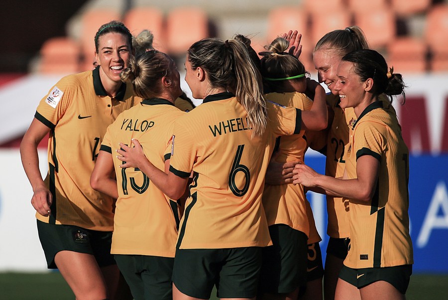 Players of Australia celebrate scoring during the Group B match against Indonesia at the 2022 AFC Women's Asian Cup in Mumbai, India on Jan. 21, 2022. (Xinhua/Javed Dar)