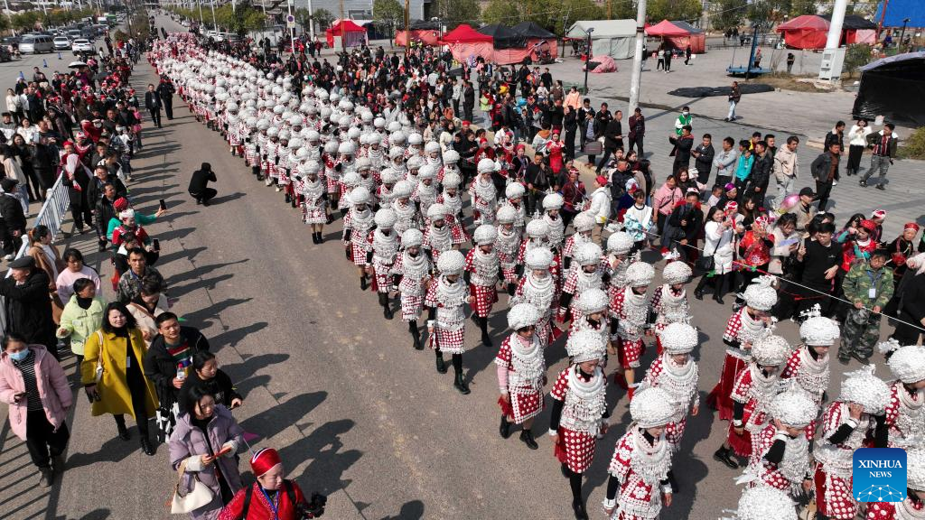 This aerial photo taken on Jan. 31, 2023 shows people of Miao ethnic group in traditional costumes participating in a parade to celebrate the upcoming Lantern Festival in Huangping County, southwest China's Guizhou Province. The Lantern Festival, the 15th day of the first month of the Chinese lunar calendar, falls on Feb. 5 this year. (Xinhua/Yang Ying)
